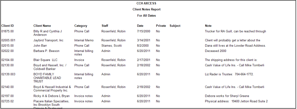 The Client Notes report displays the client notes for multiple clients. This report has the option to view the full note or a note summary.