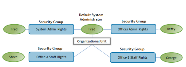 The number of security groups for your firm may be defined by job requirements. In the following example, four security groups define the access to product functions for a system administrator, an office administrator in office A, and staff in office A and office B.